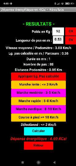 Poids en Kg : Enregistre votre poids avec le bouton « OK ». Longueur du pas en m : Vous pouvez enregistrer votre foulée en fonction de vos habitudes de marche. Le bouton « OK » enregistre la valeur. Il est conseillé d'affecter la valeur de la "Lg. de pas" si vous la connaissez avant d'effectuer le parcours. Vitesse moyenne : Vitesse calculée en fonction de la distance donnée par le GPS (Valeur plus précise que la valeur de la distance calculée par le podomètre) et la durée totale de marche. La longueur de pas calculée en mètres est réalisée à partir de la distance GPS et le nombre de pas réalisé. Vous pouvez appliquer cette valeur lors du dernier parcours réalisé. Durée podomètre en minutes. Nombre de pas en fonction du parcours réalisé. Distance podomètre en Km Le bouton « Appliquer Lg. Pas calculée » affecte la valeur en m de la longueur de pas calculée. En fonction du résultat du calcul de la vitesse moyenne calculée vous pouvez sélectionner votre type de marche par rapport au parcours réalisé. Le bouton « Calculer » permet de calculer votre dépense énergétique en fonction du parcours en cours. (Voir ci-dessous le principe de calcul) Le bouton « Retour » permet de revenir à la fenêtre principale. |