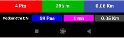 Première ligne - GPS - En bleu : Distance GPS calculée lors du déplacement Deuxième ligne - Podomètre En bleu : Nombre de pas réalisés En rose : Durée du parcours / Podomètre En gris: Distance calculée / Nbr Pas Podomètre et Longueur de Pas enregistrée. |