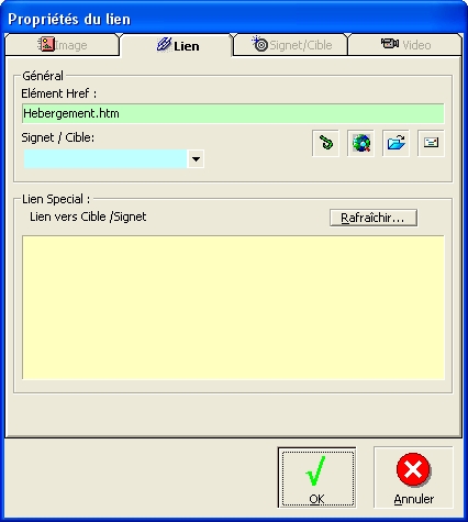 Les liens peuvent porter sur des adresses Web (http://....), documents HTML, images, fichiers zip, appel d'une adresse E-mail, ou appel d'une fonction javascript, ou des signets.