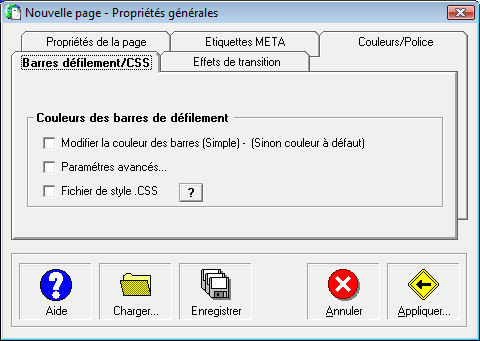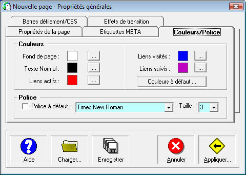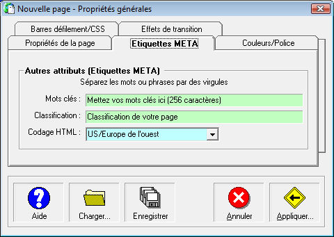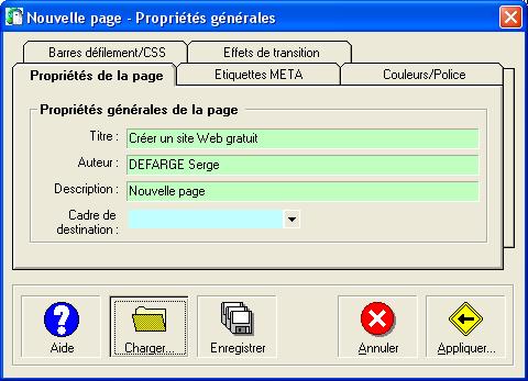 Confirmer la création d'un nouveau document HTML puis compléter les différentes rubriques. Il n'est pas obligatoire de remplir tous les champs, les propriétés, couleurs, étiquettes META, couleurs des barres de défilement, etc... pourront être définies ultérieurement. Le bouton <Enregistrer> permet de sauver les informations données et le bouton <Charger > permet de restituer des informations sauvegardées.