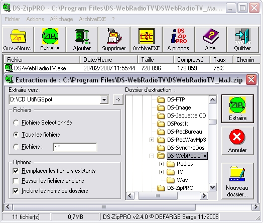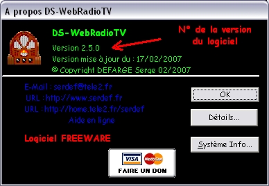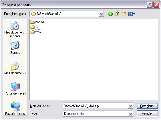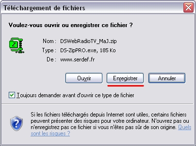 Installation des mises à jour -1 - Mise à jour du logiciel - Vérifiez le numéro de version du logiciel --> Menu " ? " --> " A propos " - Si le numéro de version de votre logiciel ne correspond pas à la dernière mise à jour téléchargez le fichier de mise à jour du logiciel : DSWebRadioTV_MaJ.zip - Enregistrez le fichier directement dans le dossier d'installation de DS-WebRadioTV ou après enregistrement dans un dossier temporaire décompressez le fichier dans le dossier d'installation. - Extraire le fichier DSWebRadioTV_MaJ.zip dans le