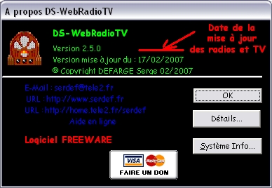 dossier d'installation de DS-WebRadioTV. -2- Mise à jour de toutes les radios et TV Si la date de version des mises à jour est différente de votre logiciel. - Téléchargez le fichier Radios.exe et enregistrez le dans le dossier d'installation de DS-WebRadioTV. - Exécutez le fichier en le sélectionnat avec l'Explorateur Windows. - Remplacez tous les fichiers existants. -3- Mise à jour des dernières radios et TV Si vous êtes sur d'avoir la dernière version des mises à jour. - Télécharger le fichier Mise à jour Radios.exe qui correspond à la dernière version des mise à jour des radios et TV. - Enregistrez le fichier dans le dossier d'installation du logiciel. - Exécutez le fichier et remplacez tous les fichiers existants. |