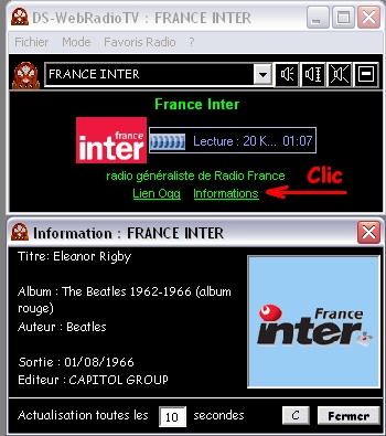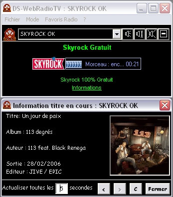 Les différénts modes de DS-WebRadioTV Exemples de Radio - Réglage du volume - Informations radio - Gestion des favoris - Exemple de TV - Autres TV - Journaux régionaux Exemple de radio utilisant le lecteur Windows Media Player Exemple de radio utilisant le lecteur Real Player Vous pouvez modifier le volume sonore ou le rendre muet en cliquant sur le bouton de réglage. Affichage des Informations des 5 derniers titres Si le lien <Informations> existe sur la radio en cours, un clic sur le lien permet d'afficher les information du titre musical en cours ou des 5 derniers titres diffusés. DS-WebRadioTV permet de mettre en mémoire 20 favoris radio au maximum. Vous pouvez ajouter ou supprimer les radios de la liste des favoris à votre guise. Les modifications ne seront prises en compte qu'au prochain lancement de DS-WebRadioTV. Exemple de TV en fenêtre PopUp DS-WebRadioTV gère les TV Internet suivant 2 méthodes : - 1 - En fenêtre PopUp avec le menu <Mode> <TV>. En fonction du pare feu de Windows vous devez autoriser la fenêtre PopUp (Clic droit dans le bandeau haut de la fenêtre) La TV en fenêtre PopUp Le menu