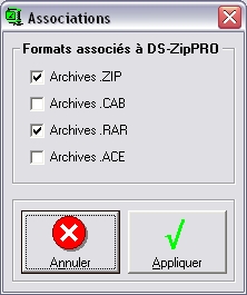 Associations : Paramétrages des associations des formats d'archive avec DS-ZipPRO. On peut associer les format ZIP-RAR-ACE-CAB avec DS-ZipPro.