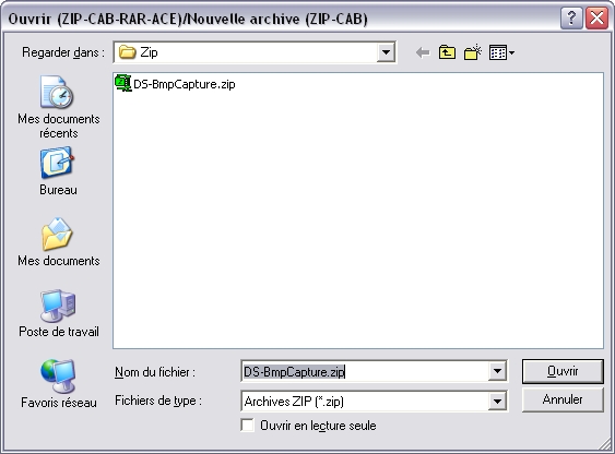Ouvrir/Nouveau : Ouvre un fichier archive au format ZIP-CAB-RAR-ACE existant ou crée un nouveau fichier ZIP-CAB.