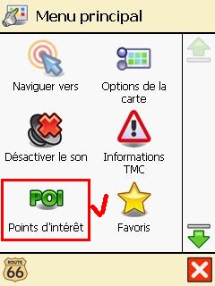 1 - Lancez Route66 Navigate v7 et cliquez sur l'écran pour ouvrir le menu principal 2 - Sélectionnez l'option "Points d'interêt"