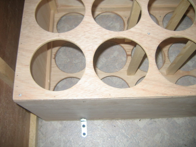 J'ai donc réalisé un casier à bouteilles qui s'insère dans le coffre sous banquette de façon à maintenir en position verticale les bouteilles en verre ou plastique. J'ai utilisé des plaques de contre plaqué d'épaisseur de 5mm et des liteaux de 15x15 mm.