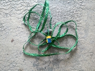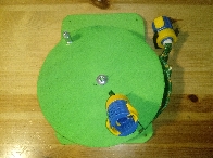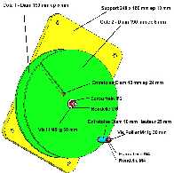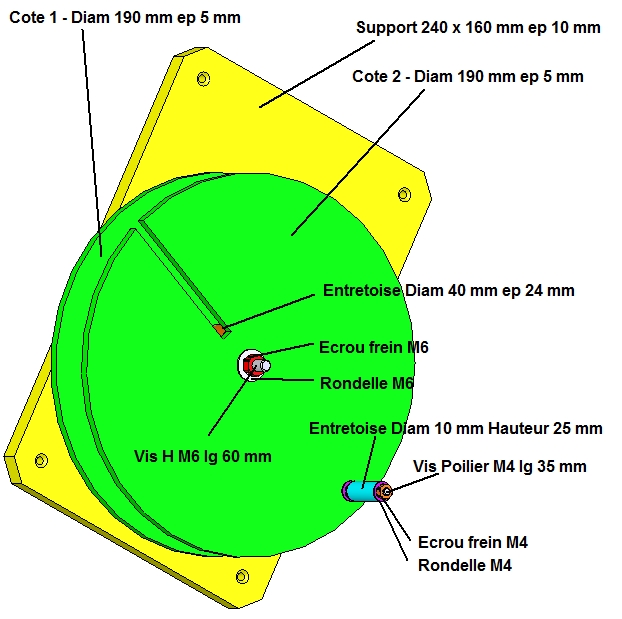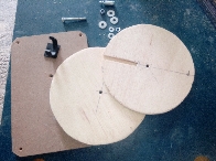 Deux planches de contreplaqué de diamètre 190 mm, épaisseur 5 mm, un support de 240 x 160 mm de 10 mm d'épaisseur, 1 vis H M6 x 60 mm, 1 vis Poilier M4 x 35 mm, quelques rondelles et écrous..., un peu de peinture verte de colle et c'est pratiquement tout.