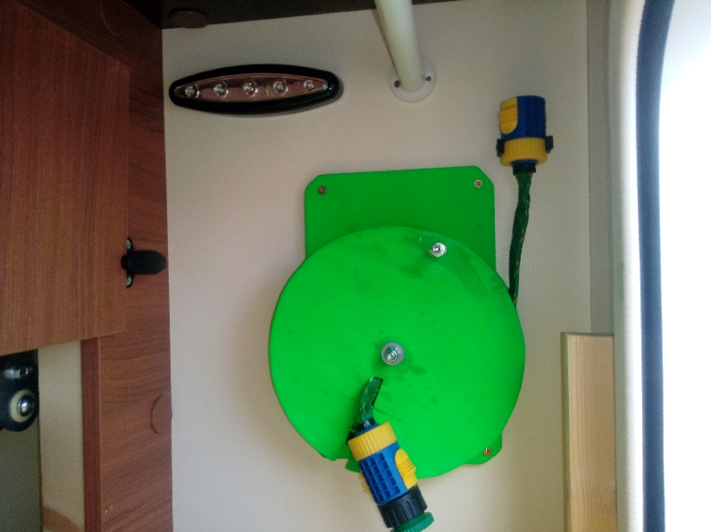 Souvent nous avons besoin que de quelques mètres de tuyau pour faire le plein de nos réservoir d'eau propre. Inutile de dérouler les 15 ou 25 mètres de tuyau du gros dévidoir. J'ai donc réalisé un mini enrouleur qui permet d'enrouler 5 mètres de tuyau plat qui tient dans de petites dimensions : 190 mm x 250 mm x 50 mm d'épaisseur. Cet enrouleur sera directement fixé dans la soute.(5 mètres de tuyau dans 400 cm²)