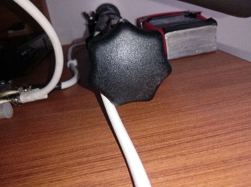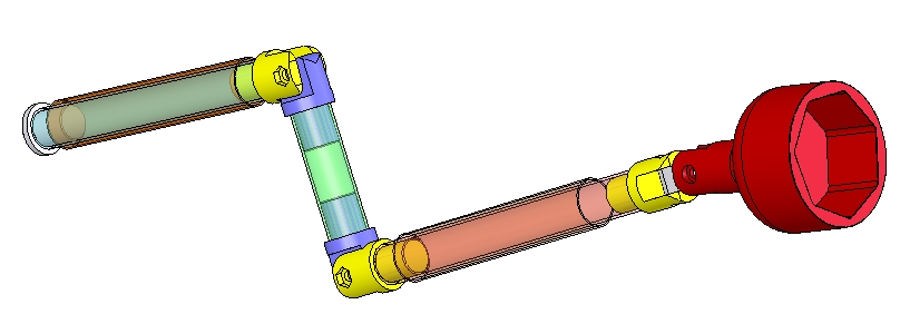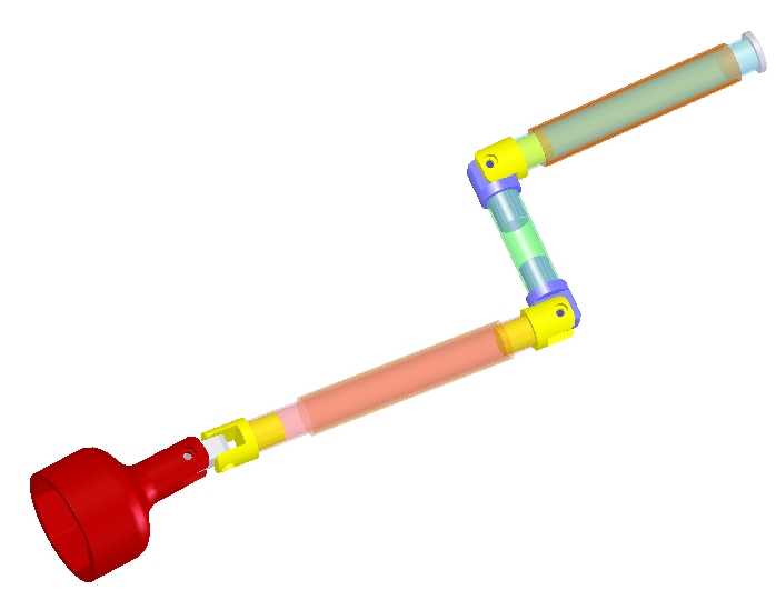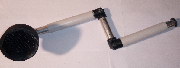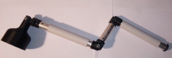 Les tubes sont en aluminium et sont des récupération de piquets de tentes. Les cardans, mâles, femelles ainsi que le bouchon et embout spécifiques seront réalisés sur imprimante 3D en ABS et seront immobilisés par l'intermédiaire de goupilles mecanindus de diamètre 3mm. Des vis Chc M4 x 20 et écrous M4 frein "Nylstop" assurent les différentes articulations entre les cardans. Les 2 tubes de diamètre 19.5 sont libres en rotation.