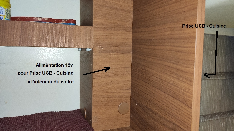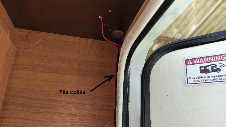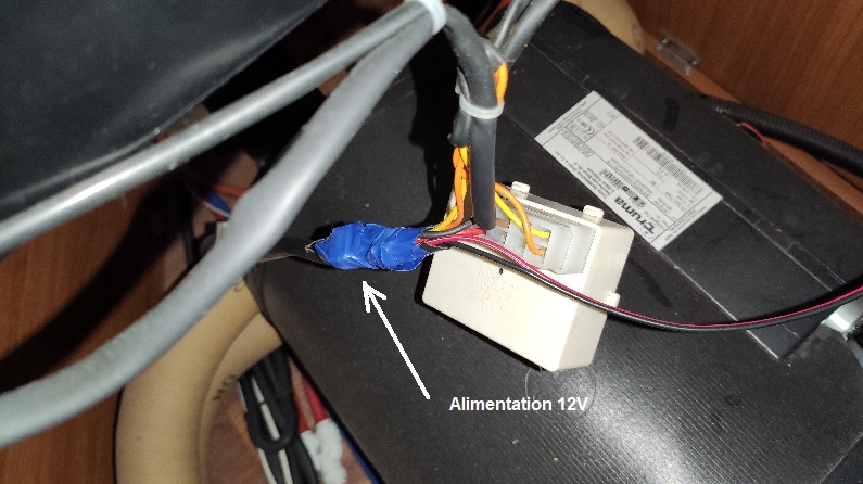 J'ai donc trouvé ces fils 12 V CC pour la chambre sur l'alimentation de la chaudière Truma et dans la cuisine les fils d'alimentation de la hote aspirante situés dans le placard au dessus de celle-ci.