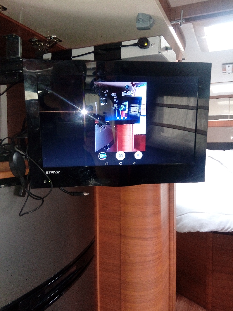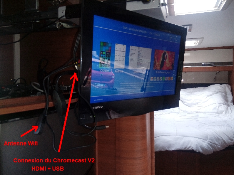 Les 2 solutions Box TV Androïd ou ChromeCast sont 2 solutions facilement exploitables en camping-car. Pour la box TV Androïd il est conseillé de faire un cordon d'alimentation USB 5VCC afin de brancher directement la box sur une prise USB du téléviseur. Le système Box TV est facilement transportable de votre salon vers votre camping-car (et réciproquement), il suffit de modifier les identifiants de la connexion internet et mot de passe.