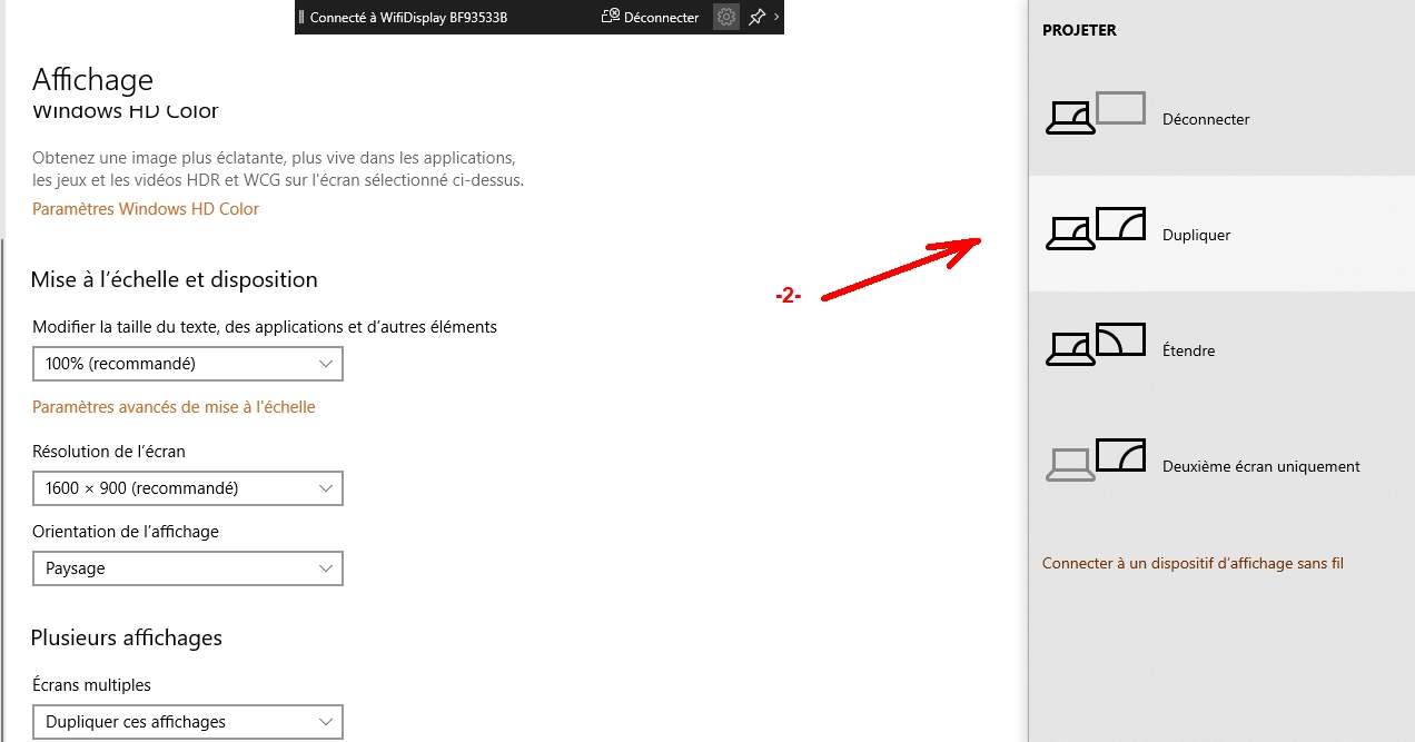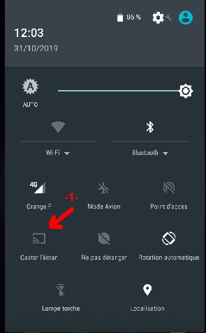 ![]() -1- Dans les menus de paramétrages, après la connexion du Chromescast sélectionner "Caster l'écran" |