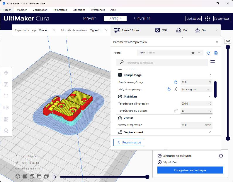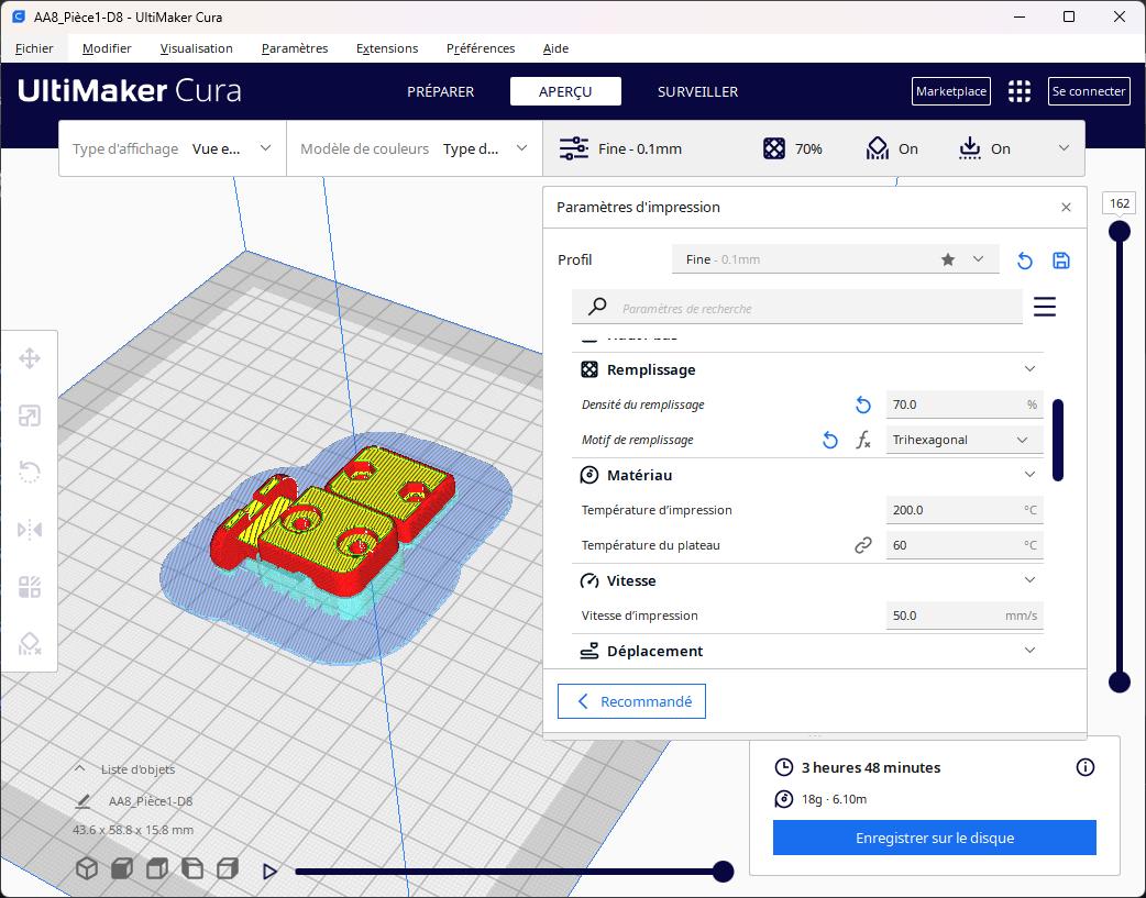 Le remplissage es à 70% - La qualité est de 0.1 mm - Intérieur en trihexagonal pour une meilleure résistance Cliquez sur l'image pour visualiser plein écran et voir les paramètres d'impression |
