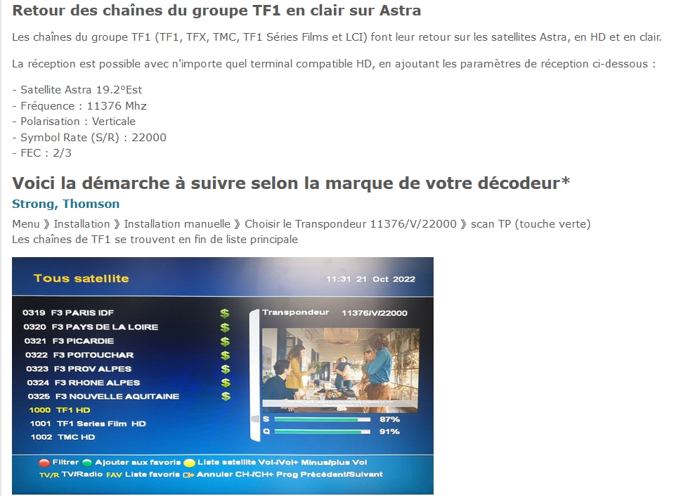 Depuis le 2 septembre 2022, la diffusion des chaînes TF1-TMC-TFX-TF1 Séries-Films-LCI s'est arrêtée pour les téléspectateurs équipés d'une offre TNTSAT ou Canal + par satellite. Voici la marche à suivre pour retrouver rapidement l'accès à ces chaînes en basculant vers l'offre satellite FRANSAT et en conservant TNT SAT au cas ou le groupe rediffuserait leurs chaînes.