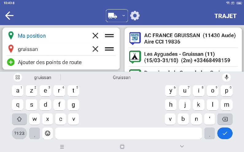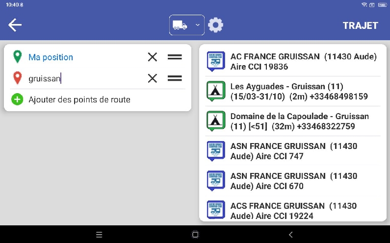 la tablette TAB6 Magic Earth est configuré en mode Camping-Car (Camion avec