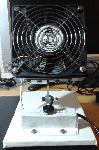 Ventilateur terminé avec son socle contenant le variateur et supportant le système d'inclinaison.